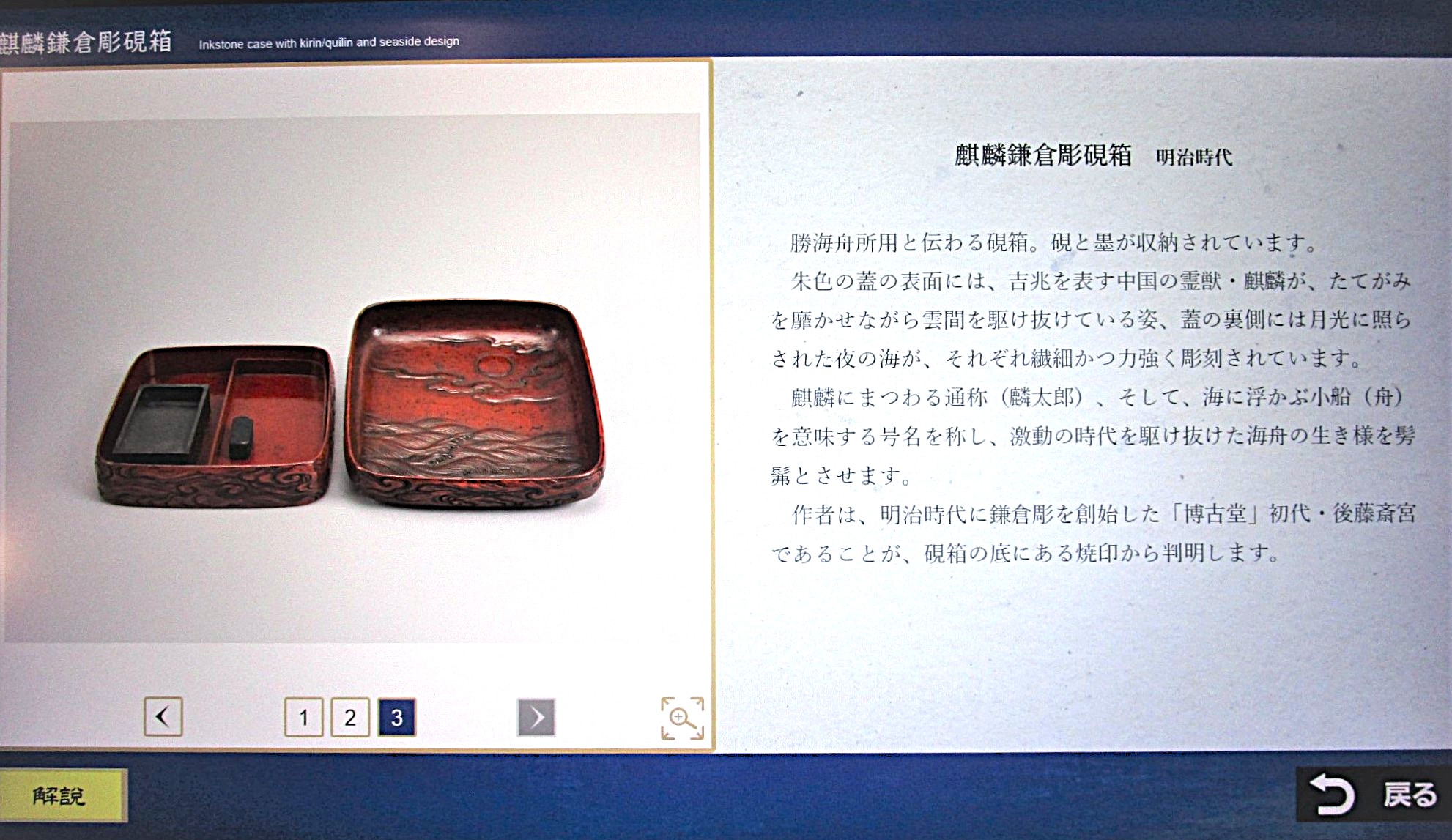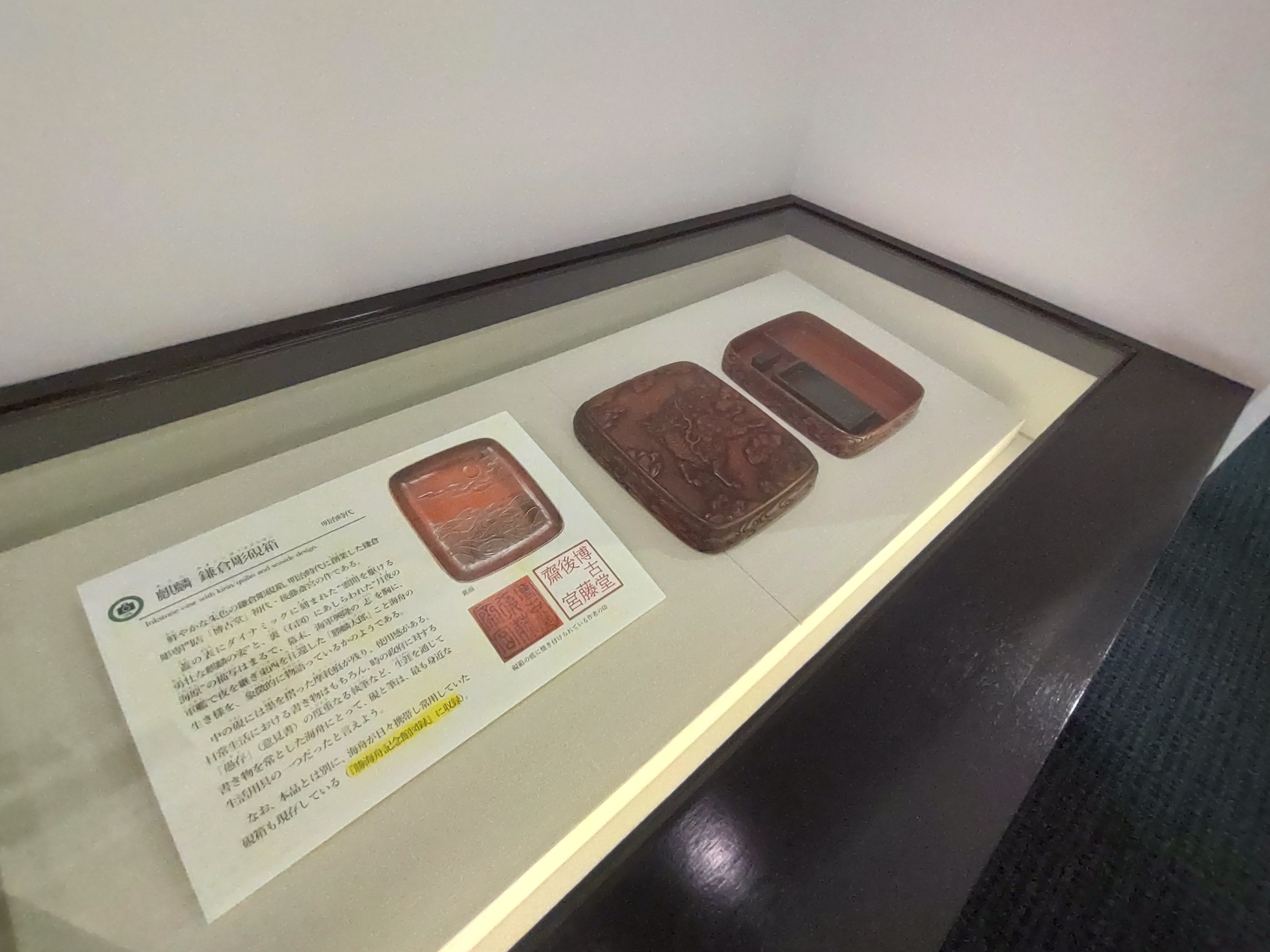 勝海舟が使用したと伝わる、明治期 後藤斎宮作の麒麟文硯箱が展示されております。