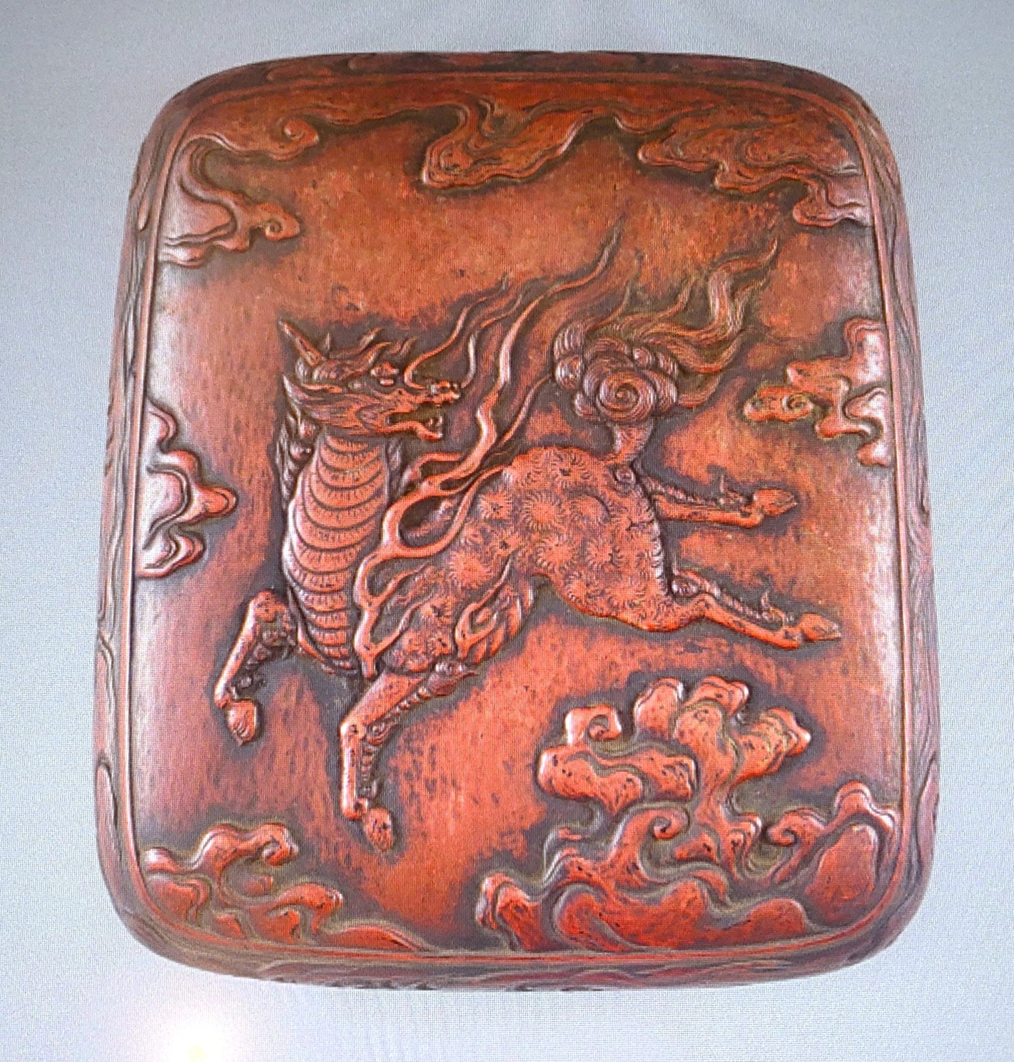 蓋表には麒麟が、蓋裏には月と波が彫られてあり、勝海舟の名前の麟太郎と号の海舟の名を連想させます。