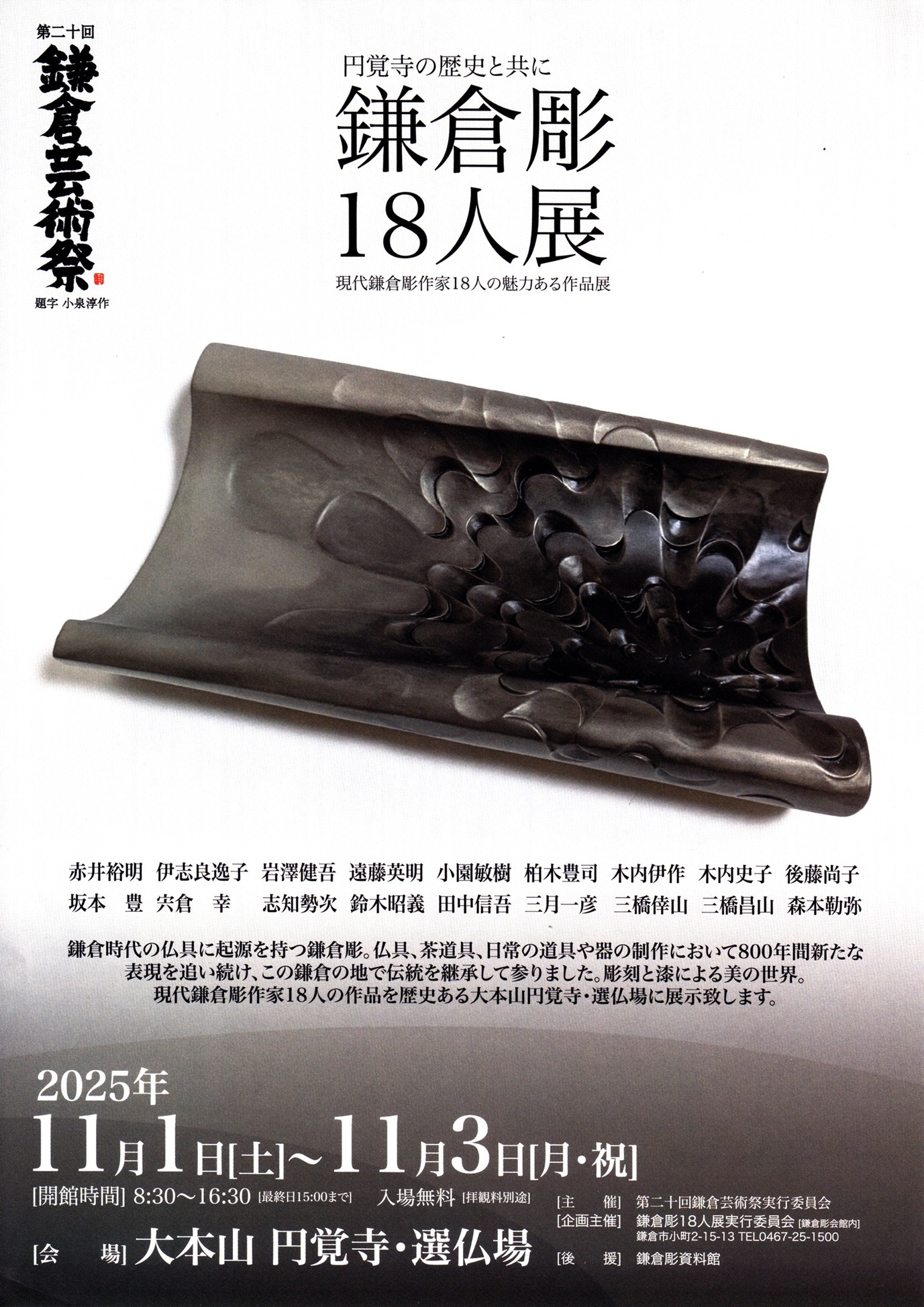 「第二十回鎌倉芸術祭 ―円覚寺の歴史とともに― 鎌倉彫18人展」 が11/1㈯から開催予定です。当会会長後藤尚子を含む現代鎌倉彫作家18人の作品を北鎌倉の円覚寺・選仏場にて展示いたします。是非ご高覧ください。