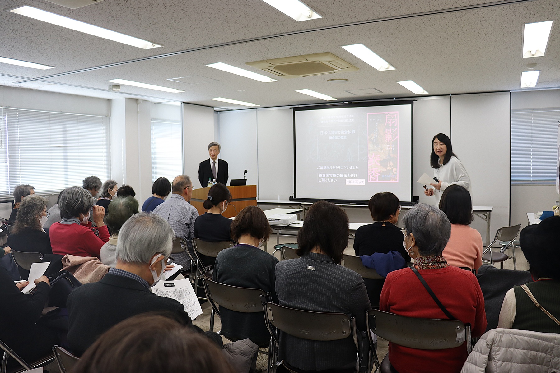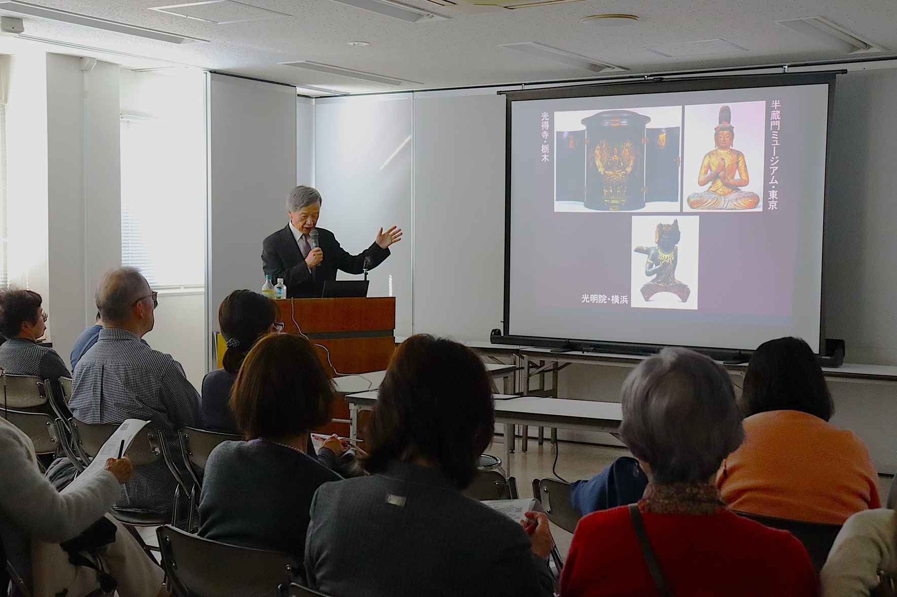 記念講演では、運慶研究の第一人者でいらっしゃいます山本 勉先生(現鎌倉国宝館館長・半蔵門ミュージアム館長)をお迎えし、「日本仏像史と鎌倉仏師 ―鎌倉彫の源流―」と題した貴重なご講演を拝聴いたしました。この講演を通じて、当会創設者である後藤家の歴史ある系譜に改めて触れ、会員一同、鎌倉彫を取り巻く様々な側面について認識を深め、気持ちを新たにする機会となりました。